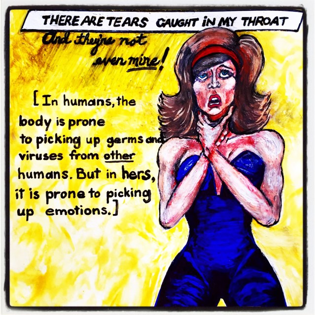 And the above illustration of my dream sums this up perfectly. I really AM susceptible to “catching” other people’s emotional states like most people catch colds. (Interestingly, I rarely catch colds or the flu or other mystery viruses that “everyone in L.A. has right now!”). And once I tune in to your emotional needs, (which is to say, once I inhale oxygen) without consciously TRYING to, my brain is firing up at astronomical speeds; calculating what you want to hear, what my facial expressions should be while you’re talking, what I should say to make you feel happy and at ease around me. I’m basically putting on a mini solo-show every single time another human interacts with me. And it’s not as simple as “Oh, well then you’re just manipulating people to get what you can from them.” It doesn’t matter if you’re a policeman, or the pope, or my mother, or a toll booth operator, or one of my best friends. If we’re talking, there’s a wholllllle lotta work going on backstage, behind the scenes, off-camera, so to speak. The show you’re paying for is happening on my face and on my body. But the REAL show is under the bio-suit. Behind the pretty blue eyeballs and the mouth that serves as the grand entrance for all those clever, witty, insightful words that make you feel good.