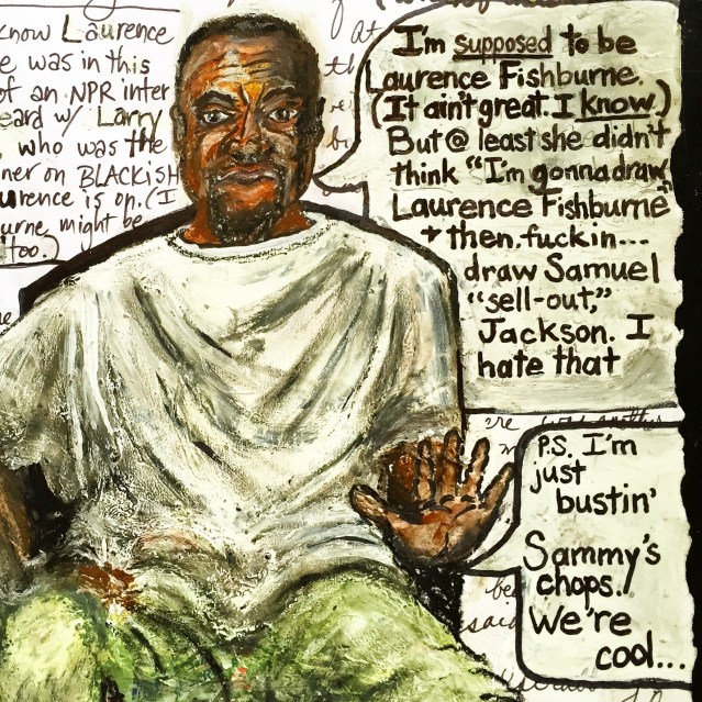 Laurence Fishburne is seated on a bus, across the aisle from the bus driver. I am seated further back. In order to get OFF the bus, I have no choice but to literally climb over Laurence. (Hmmm… Rosa Parks much, Mary?) Our limbs get all tangled up in each other. The plus side? Our bi-racial pretzel dance makes it clear that there is plenty o’ chemistry between “the fish” (Larry) and “the bird” (Mary).
