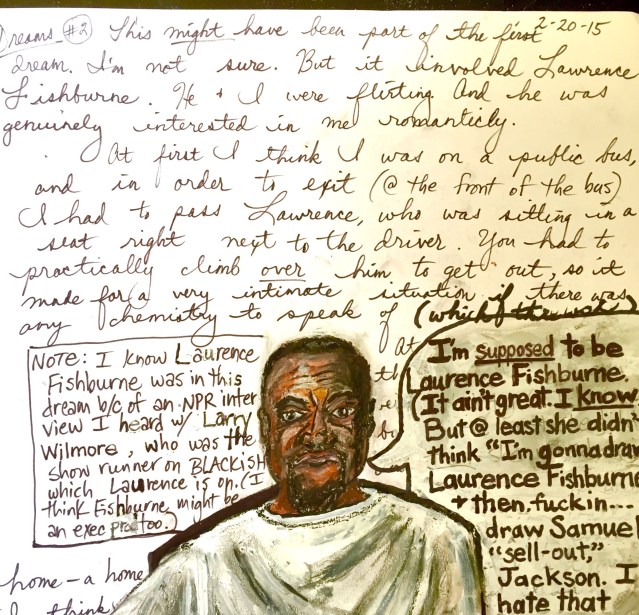Laurence Fishburne is seated on a bus, across the aisle from the bus driver. I am seated further back. In order to get OFF the bus, I have no choice but to literally climb over Laurence. (Hmmm… Rosa Parks much, Mary?) Our limbs get all tangled up in each other. The plus side? Our bi-racial pretzel dance makes it clear that there is plenty o’ chemistry between “the fish” (Larry) and “the bird” (Mary).