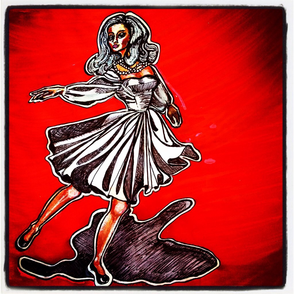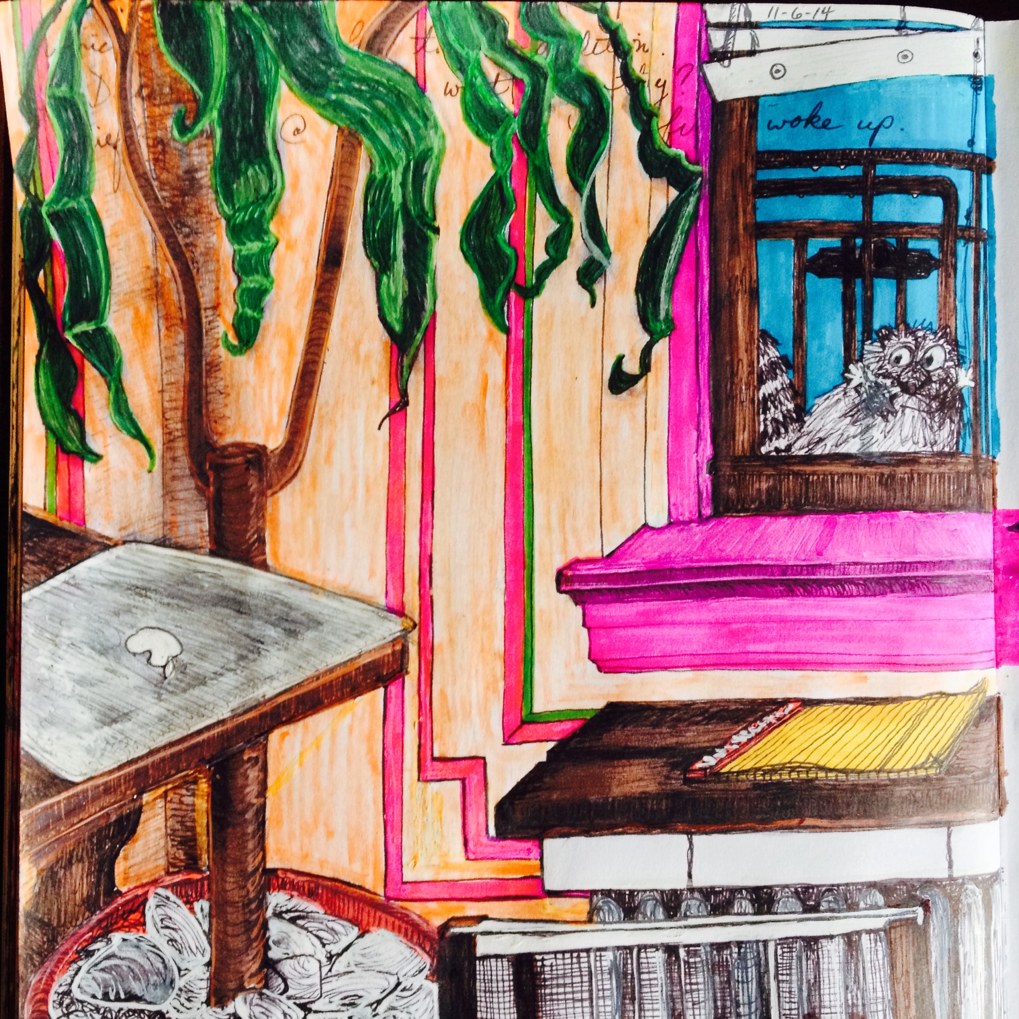 For those who are new to this blahhhhg, here’s the gist: Every morning w/o fail I draw whatever I dreamt the night before. I use magic markers, nail polish, and white-out, and they’re all in a big bound black sketch book. Kay? K. Now…